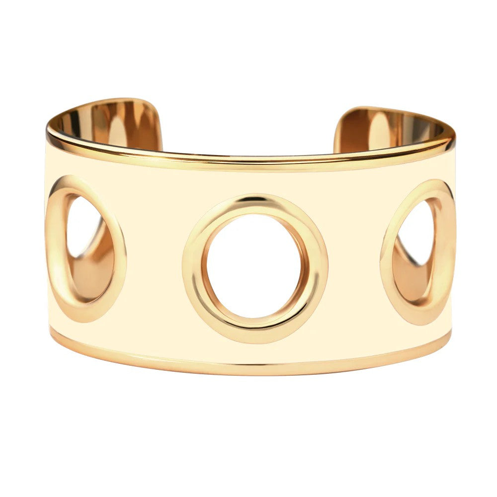 The bold EYELET cuff harmoniously combines the glamor of golden eyelets and the delicacy of sandy white enamel. Its unique and elegant design creates maximum effect, adding a touch of sophistication. Perfect for those who want to combine style and refinement with a truly exceptional piece.