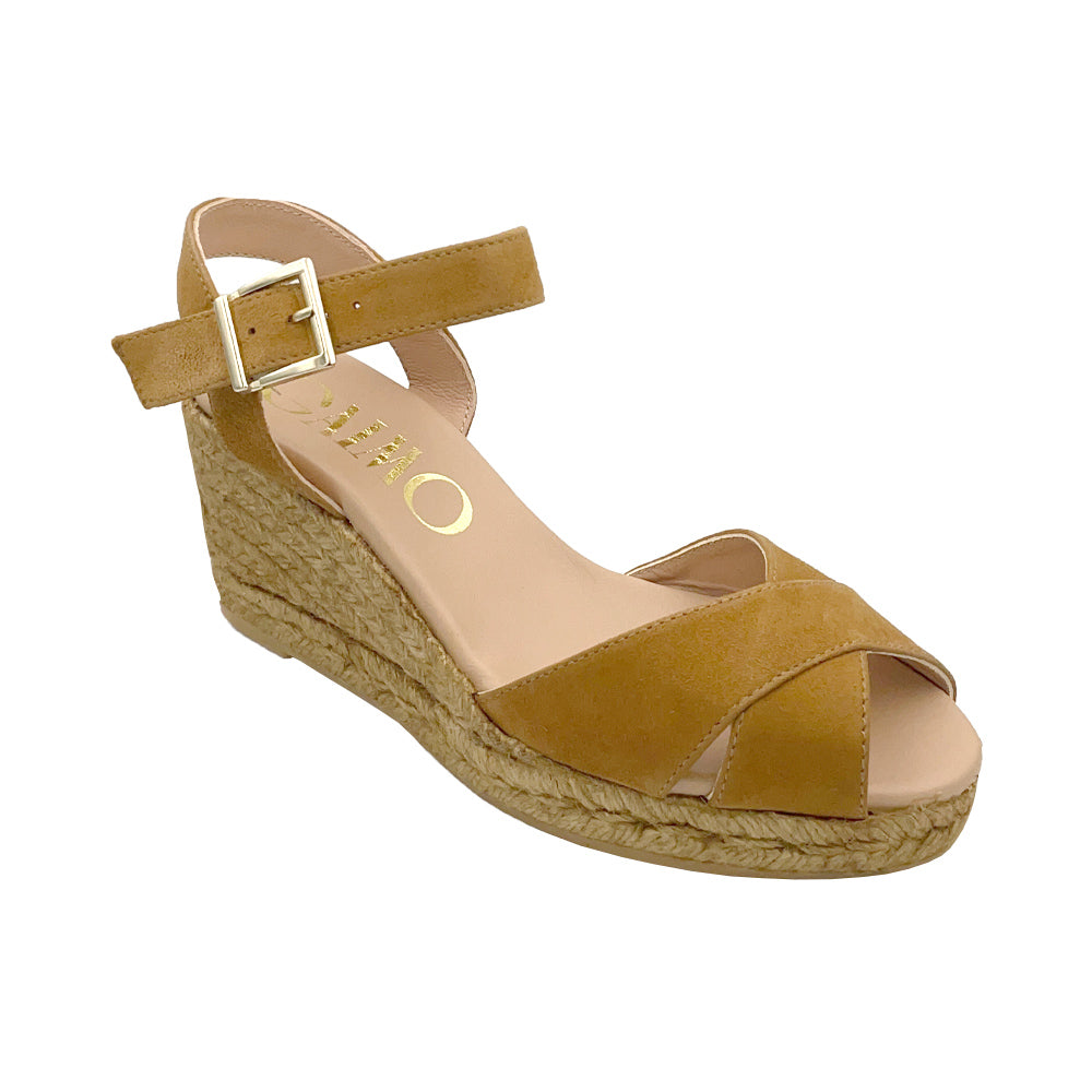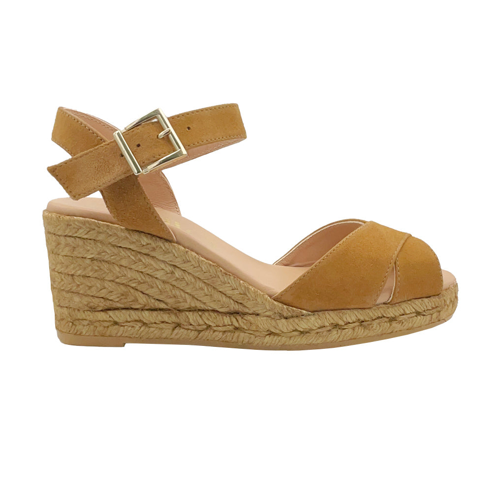 Chic classic handmade espadrille, 7 cm jute wedge in soft suede with an ankle buckle strap and leather insole, open toe and comfortable cushioned sole.