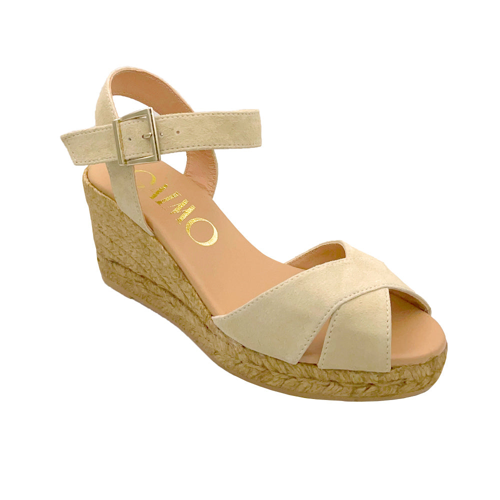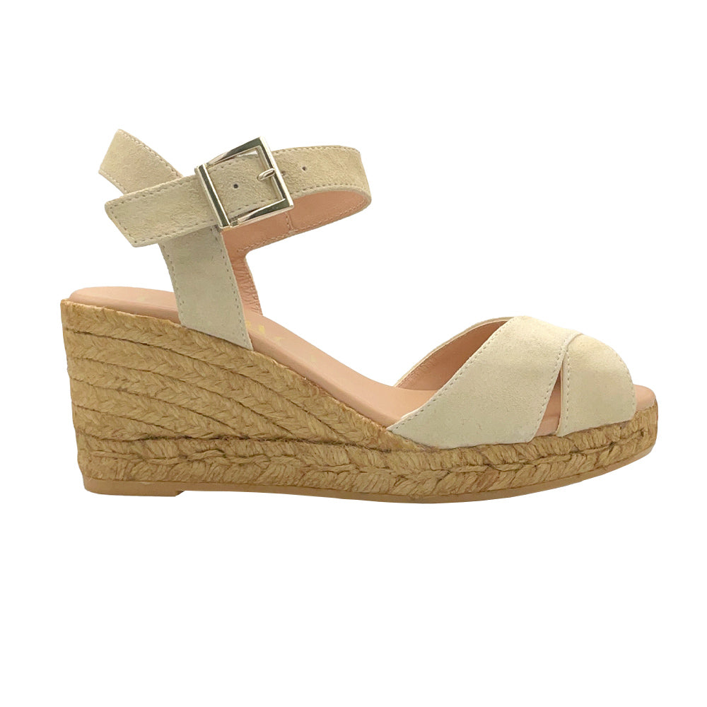 Chic classic handmade espadrille, 7 cm jute wedge in soft suede with an ankle buckle strap and leather insole, open toe and comfortable cushioned sole.