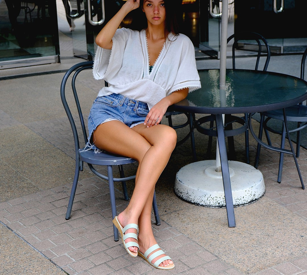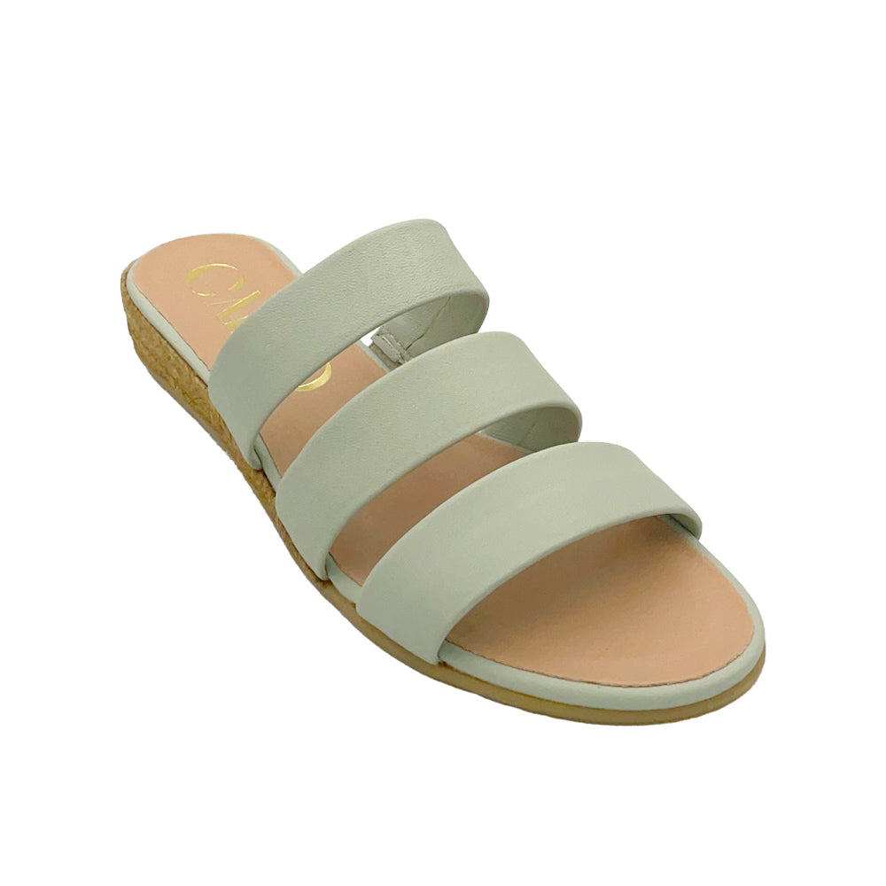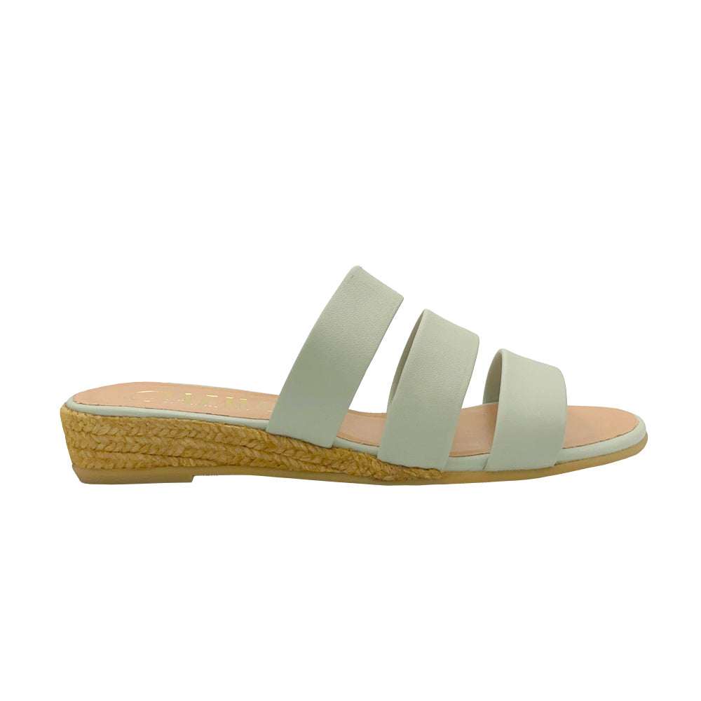 A must-have slip on, low-wedge, sandal crafted in napa leather with triple straps and very comfortable cushioned sole. A perfect espadrille for a morning-to-evening look.