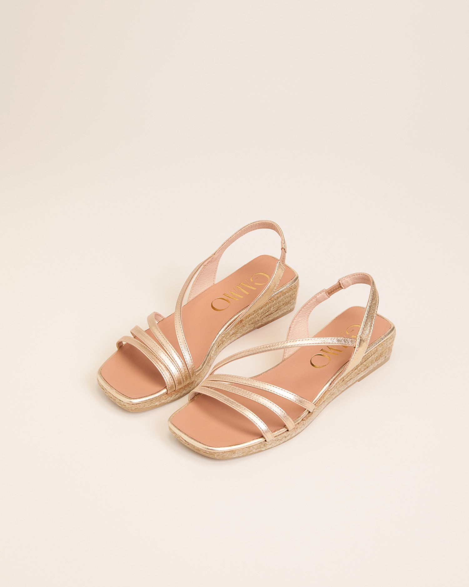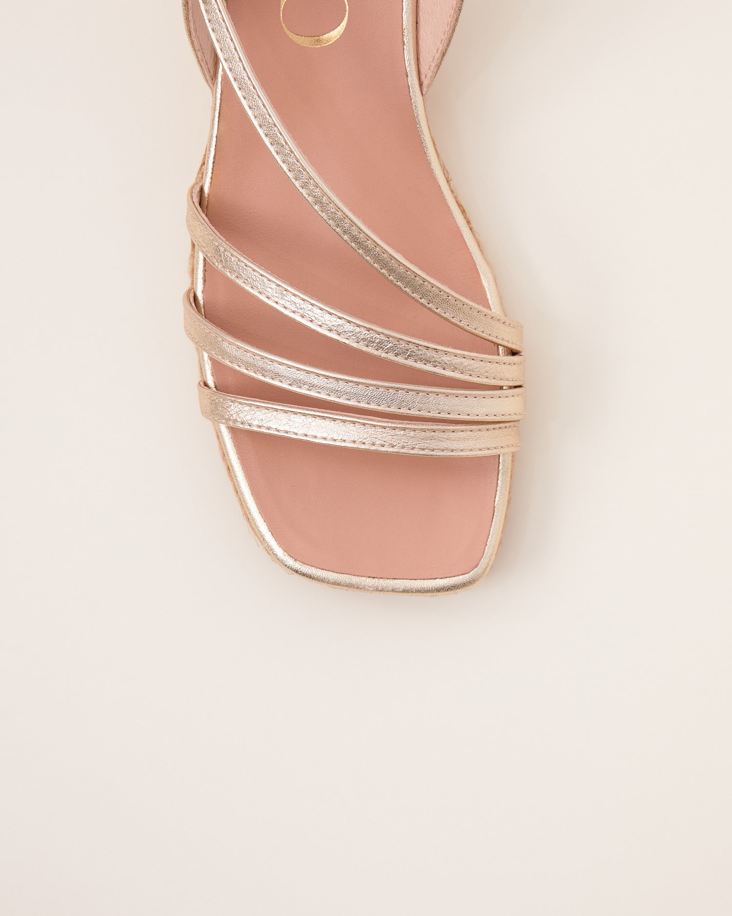 Slingback sandal espadrille, with asymmetric metallic leather straps, for a casual and chic look! Goat's leather cushioned insole and lining, with 3.5cm organic jute wedge, handcrafted in Spain.