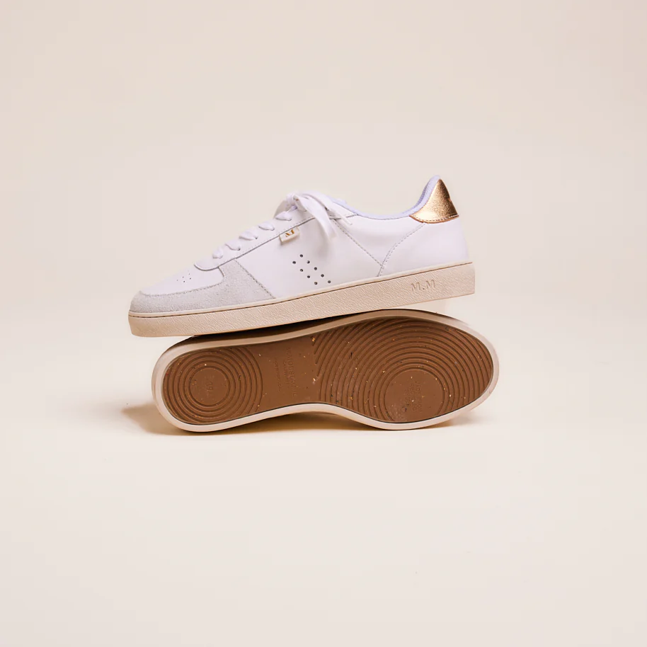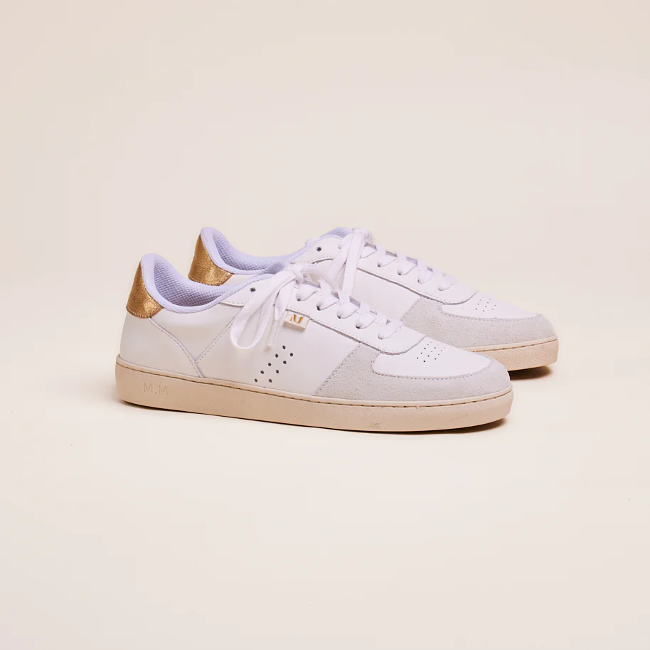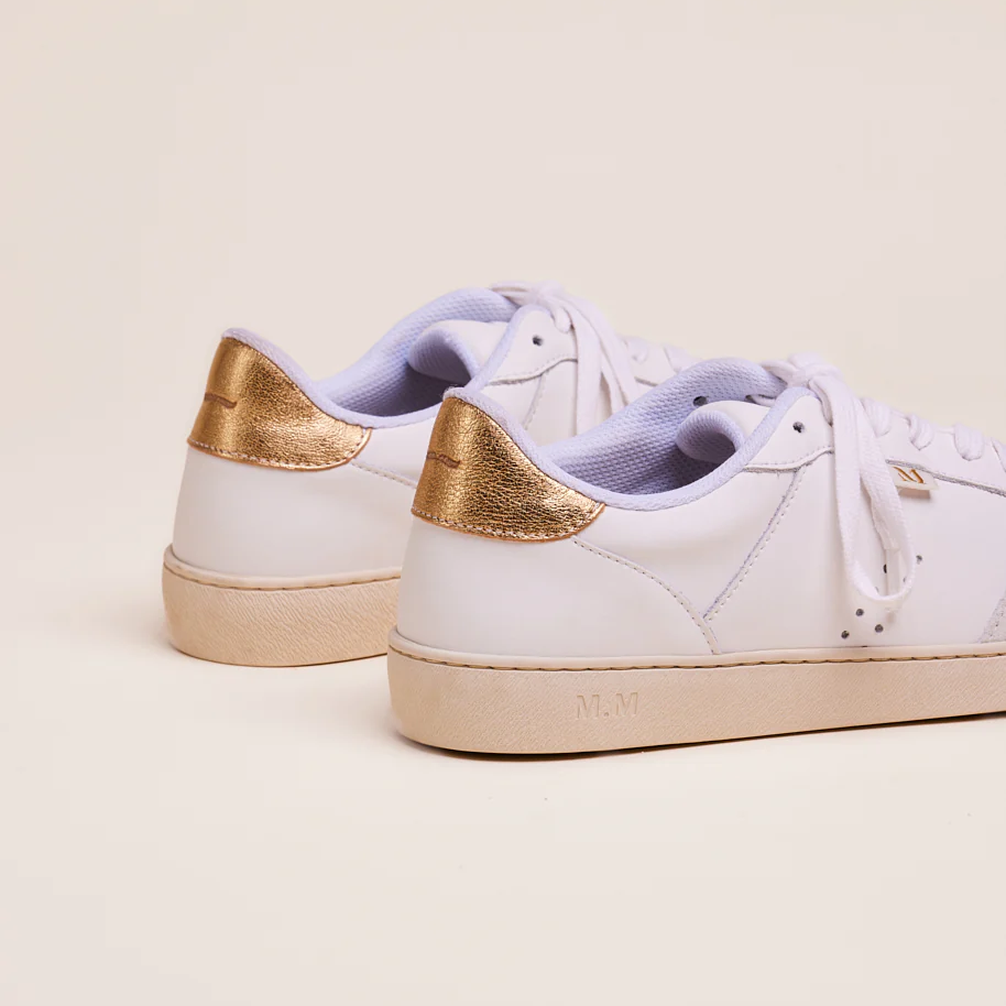 Marie in white and golden leather is a pair of trainers inspired by the retro-sport style of the 80s. It features perforated and oversized single-eyelet details. These Marie trainers for women with organic cotton laces as well as a 2.5 cm upcycled sole made from recycled shoes and rubber, affirms itself as a durable and environmentally friendly choice.