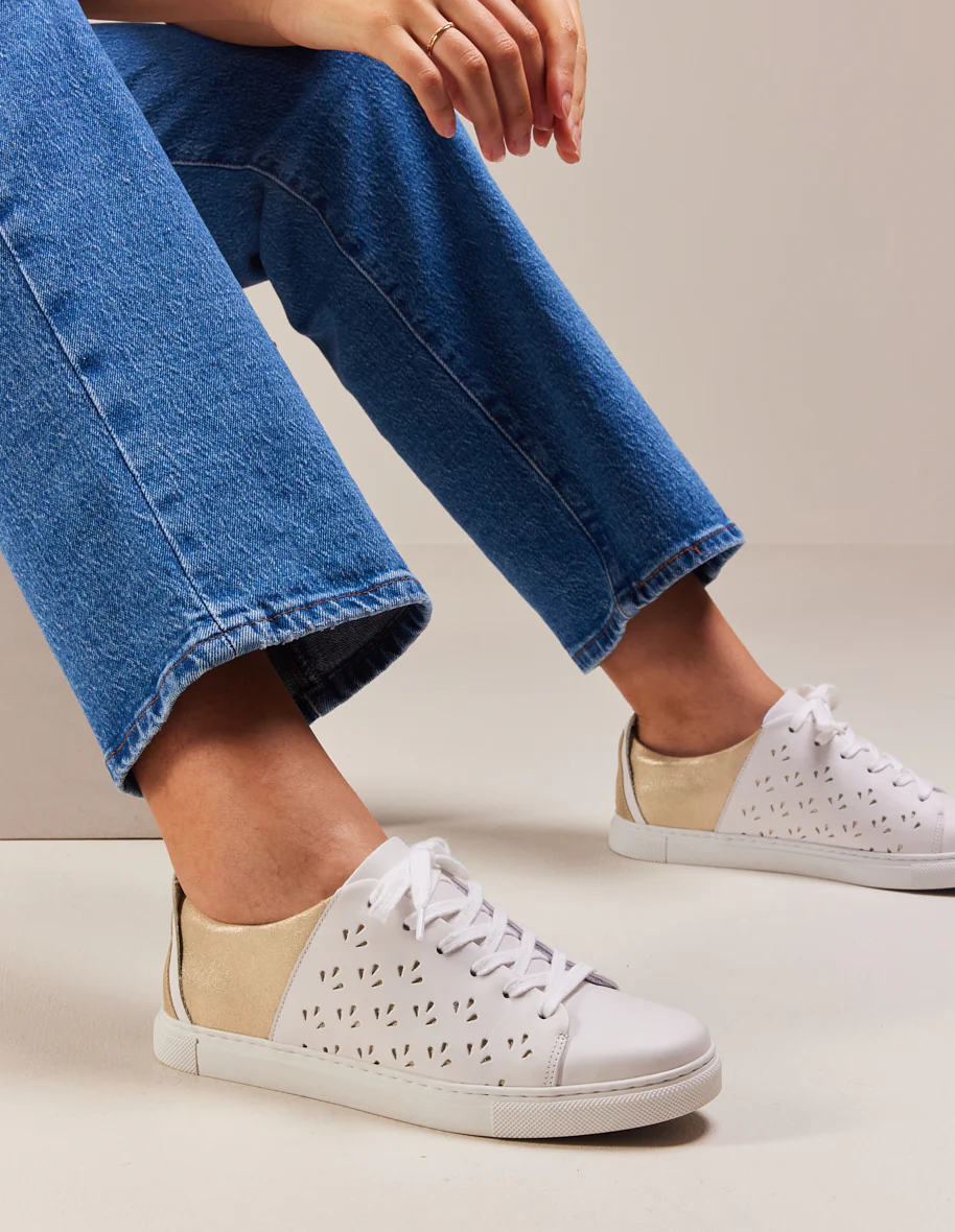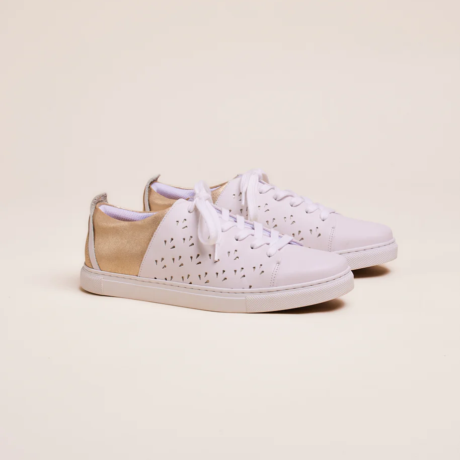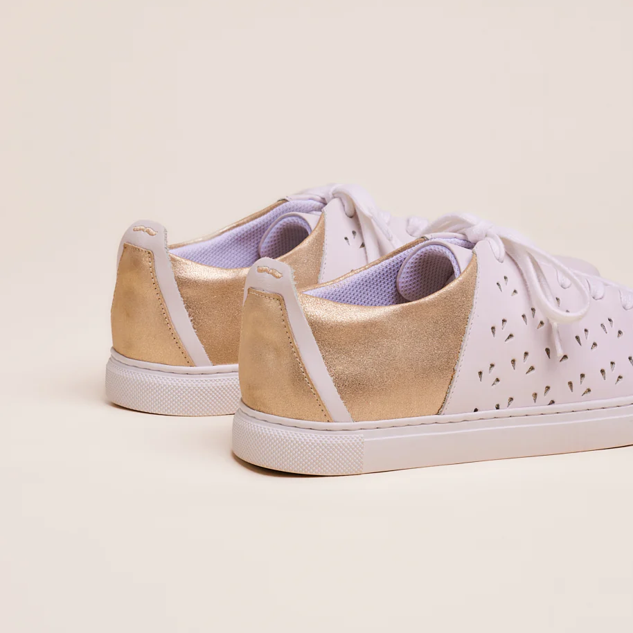 Flower power. Renée, our iconic low-top sneaker, with new floral perforations on white leather and a champagne lamé back. These Renée trainers for women with organic cotton laces as well as a 2.5 cm upcycled sole made from recycled shoes and rubber, affirm itself as a durable and environmentally friendly choice.